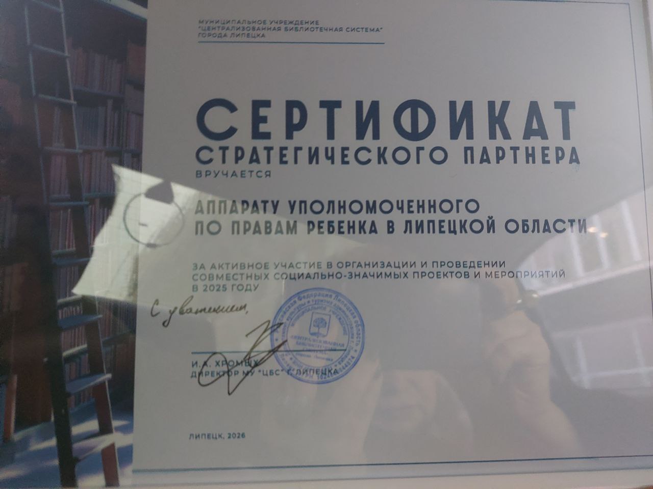 С ответной благодарностью Оксане Владимировне был вручен Сертификат стратегического партнера за активное участие в организации и проведении социально-значимых проектов и мероприятий в 2025 году.