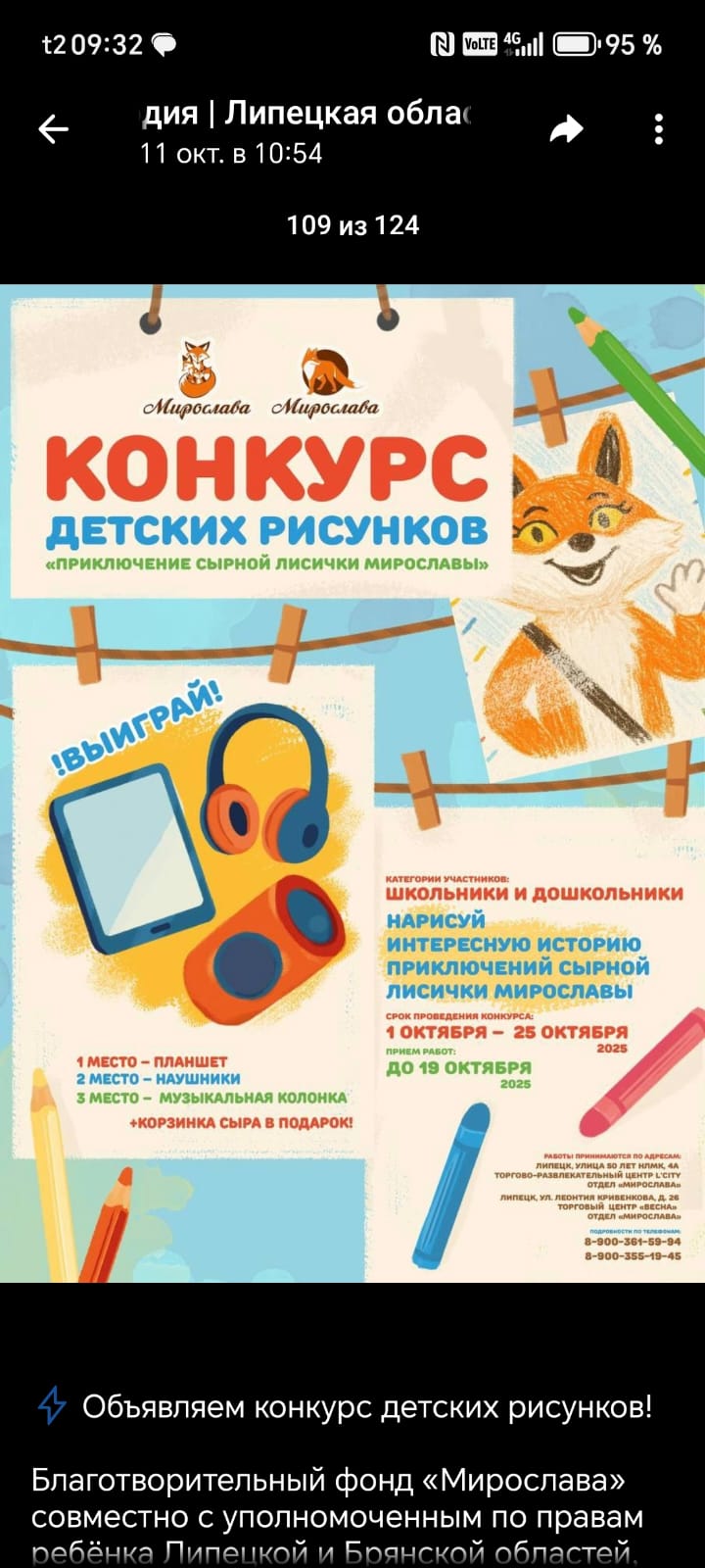 25 октября 2025 года аппарат Уполномоченного по правам ребенка в Липецкой области принял участие в церемонии награждения по итогам конкурса рисунков «Приключения сырной лисички Мирославы», который состоялся в Городском Молодежном центре. Организаторами творческого состязания выступил Брянский сыродельный завод и благотворительный фонд «Мирослава Брянск».