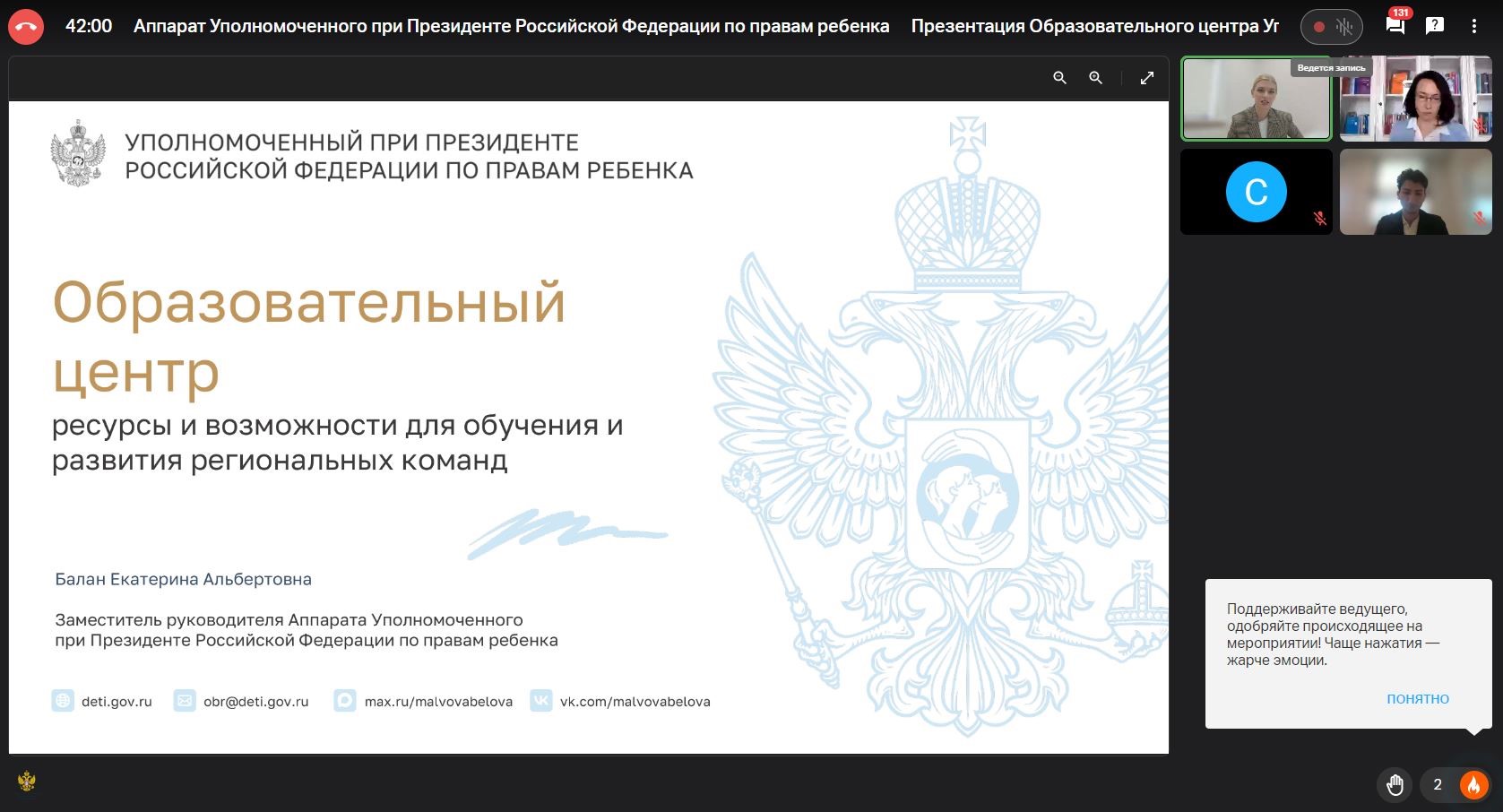 3 апреля 2026 г. Оксана Хлякина приняла участие в онлайн – презентации образовательного центра при Уполномоченном при Президенте РФ по правам ребёнка. Центр занимается подготовкой руководителей и специалистов детских учреждений, представителей органов власти, НКО и родительских сообществ, формируя у них навыки поддержки семей.